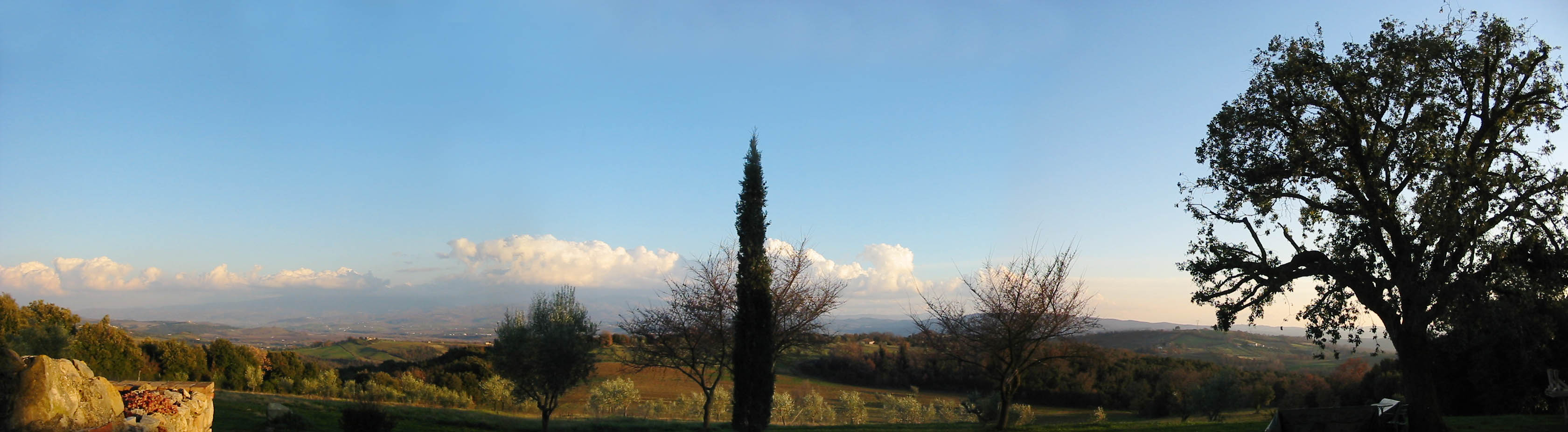 10 acres on top of a high and soft hill, with 360 degrees open views, overlooking 4 castels, one medieval town and Monte Amiata, the mountain sacred to the ancient Etruscans. 5 open acres with olive grove, ilex, oak and other old and high trunk trees. 5 woodded acres. |